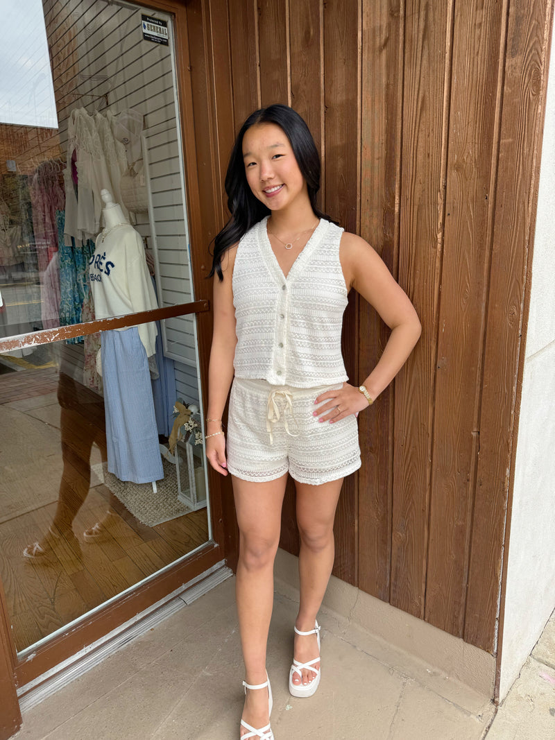 Expertly crafted with a blend of 64% polyester, 35% cotton, and 1% spandex, the Cleo Crochet Shorts offer a comfortable and adjustable fit with a cream color and round linger length. The knit detailing and pockets add a touch of style and convenience, making these shorts a go-to for any warm weather outfit.